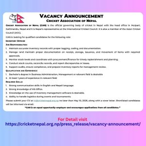 The Cricket Association of Nepal (CAN) is looking for a qualified Inventory Officer to join their team at the head office in Mulpani, Kathmandu.