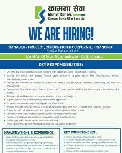 Join the team at Kamana Sewa Bikas Bank Ltd. and lead high-impact project financing initiatives.