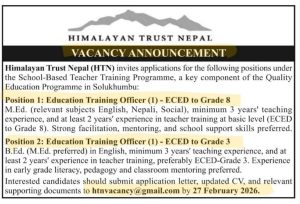 Education training officer job vacancy announcement for Himalayan trust Nepal. Form apply last date : 2026 february 27